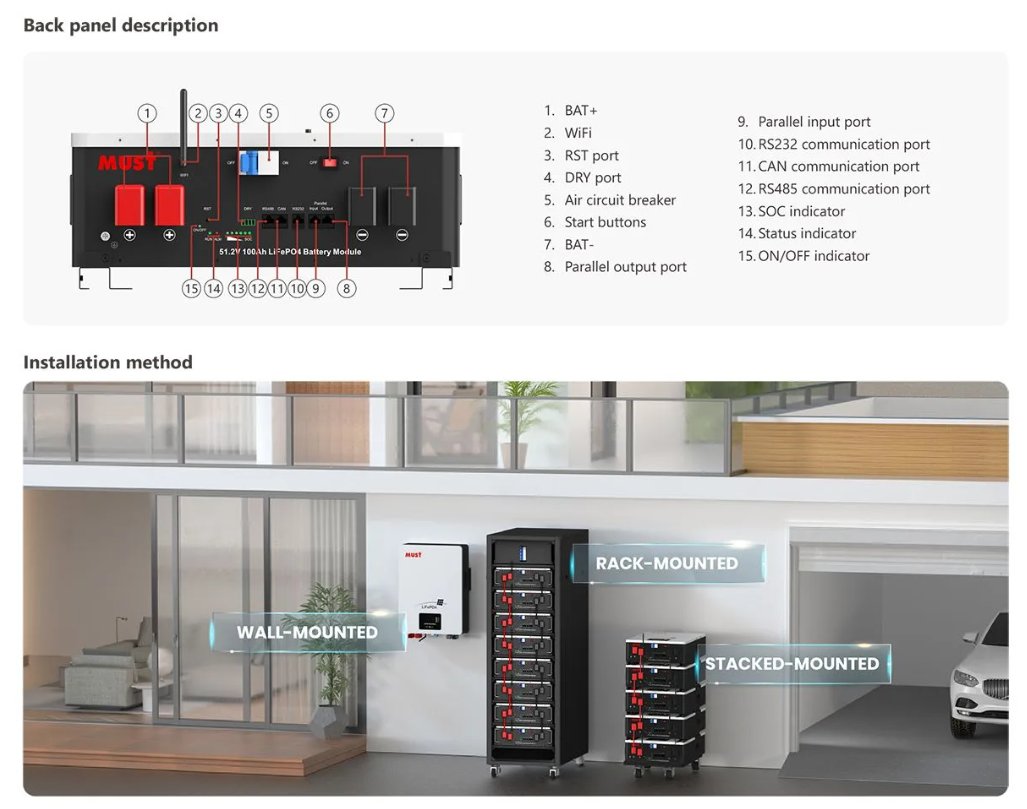 Настінний літієвий акумулятор MUST LP1600-48100 (LiFePO4) – це високоінтегроване рішення зберігання енергії для вашої домашньої сонячної системи резервного живлення. Завдяки багатому досвіду та передовим технологіям продукт має особливості модного дизайну, високої енергії, високої щільності потужності, тривалого терміну служби та простоти встановлення та розширення.