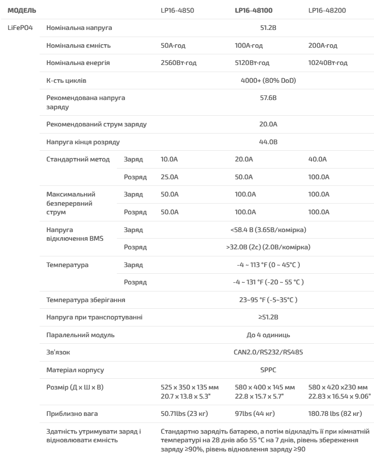 • Зберігати при 30~50% SOC (заряду). Рекомендується заряджати кожні 3 місяці. Приміщення для зберігання повинно бути чистим, прохолодним, сухим і провітрюваним.
