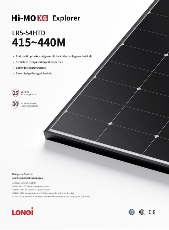 Високопродуктивний cонячний модуль потужністю 405 Вт LONGi LR5-54HIH 405M серії Hi-MO 5m – має висоту 1722 мм і ширину 1134 мм з потужністю 405 Wp. Виходячи з цих ключових даних, ця сонячна панель ідеально підходить для домашніх і комерційних застосувань. LONGi Solar є одним із провідних виробників високоефективних сонячних батарей і модулів. Понад 20 років він зосереджувався на технології монокристалічних сонячних батарей й зміг завоювати лідерство на світовому ринку.